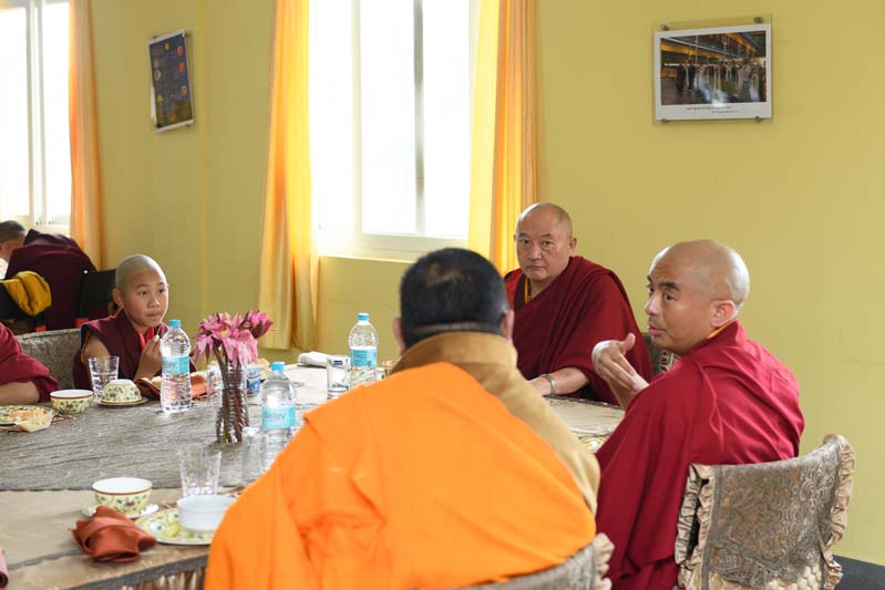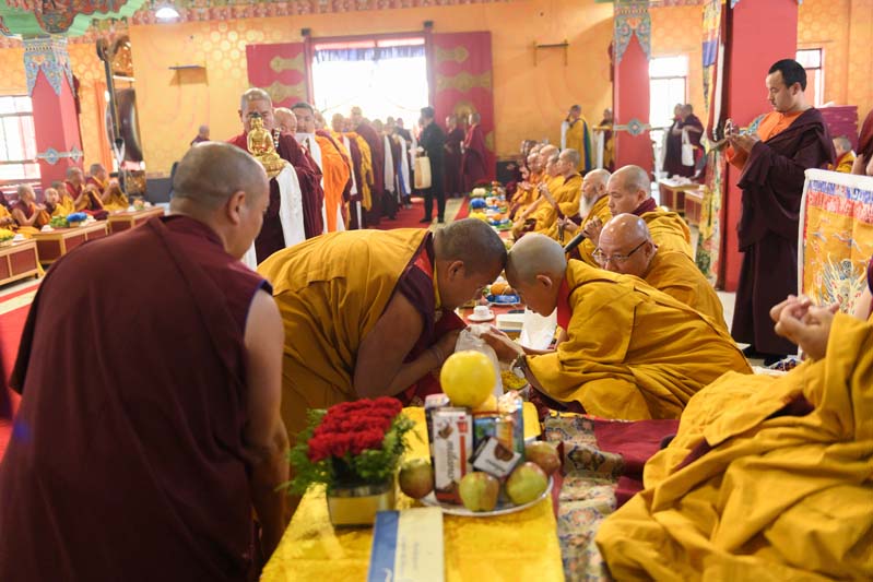 9. Bokar Yangsi Rinpoche sat between HE Zurmang Gharwang Rinpoche and his tutor, Khenpo Lodoe Donyo Rinpoche.