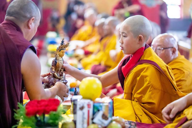 3. His Eminence Gyaltsab Rinpoche, Zurmang Gharwang Rinpoche, Yongey Mingyur Rinpoche, Khenpo Lodro Donyo Rinpoche, and the retreat master of the Ralang three year retreat center were present to offer Bokar Yangsi Rinpoche his ordination vows. The beautiful pale yellow silk robes which Bokar Yangsi Rinpoche offered to the Buddha statue are being placed on the statue by the monk in charge.