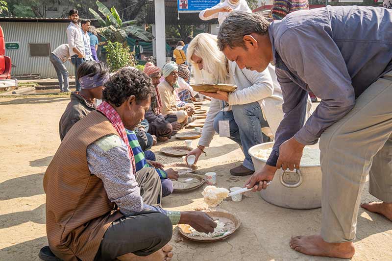 At lunchtime on 16th January 2019 the Soup Kitchen was blessed by a special visit from Yongey Mingyur Rinpoche. Although there are so many demands on his time, in a completely calm and unhurried way, he managed to connect with everyone he met. Rinpoche sat and talked with the leader of the All India Bikkhu Centre, Bikkhu Pragya Deep and made aspiration prayers with Sangha members at the feet of the magnificent standing Buddha statue. He blessed the food before serving some of the local people and then sat to sample the food himself, commenting, “This food is better than you can get in restaurants.” The volunteers were thrilled to meet with Mingyur Rinpoche in such an informal way and, before he left for his next meeting, there was time for a group photo with the whole working team. “It felt like we had been given a spontaneous teaching on how to live and work with effortless awareness and joy,” one volunteer commented. Inspired by Rinpoche’s spacious yet down to earth way of being, everything seemed to be flowing well.