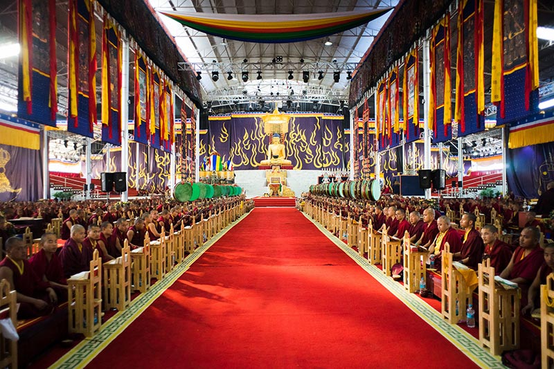 A mysterious, almost otherworldly atmosphere has been created and sustained by a powerful combination of chanting, music, incense, and visual elements strongly reminiscent of the gönkhang (protector shrine rooms) usually hidden away deep in the recesses of most Tibetan monasteries. As master set designer and director, the 17th Gyalwang Karmapa has distilled the essence and transformed the Monlam Pavilion into a contemporary version of a Tibetan monastic setting perfectly suitable for this traditional Gutor puja.
