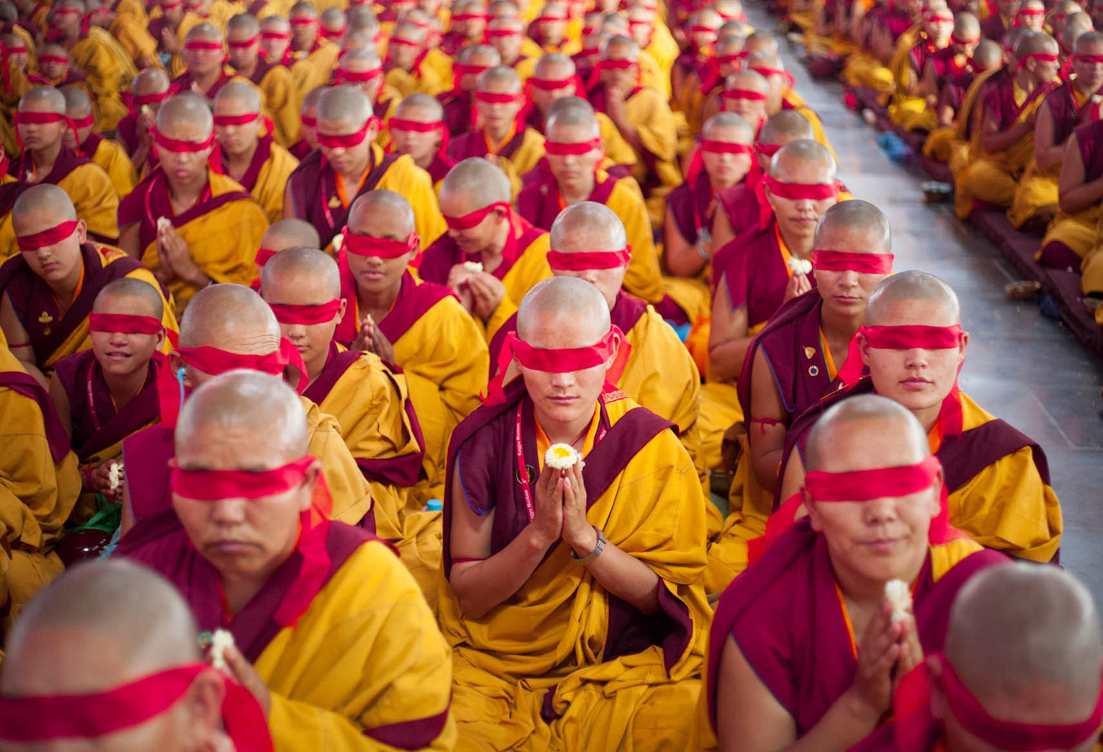 According to the tradition, red blindfolds are placed covering the eyes entirely. At this moment, His Holiness delivered some essential teachings on the path of Secret Mantra.