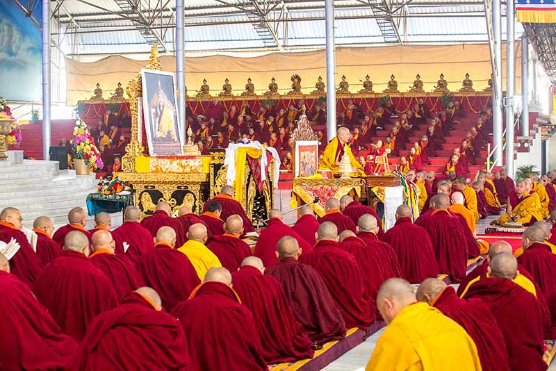Following a long stream of generous students making offerings, during which the assembly chanted the Supplication to the Lineage of the Bodhisattva Vow, the teaching began. Having laid the groundwork for this teaching on the first day, and having covered the initial verses, “Virtue in the Beginning,” on Day Two, His Eminence Gyaltsab Rinpoche today addressed the main portion of Kharak Gomchung’s Mind Training: The Seventy-Two Exhortations, ”Virtue in the Middle.” He covered Verses 15-37 in just over an hour, lending further credence to the character of the text as a pith instruction.
