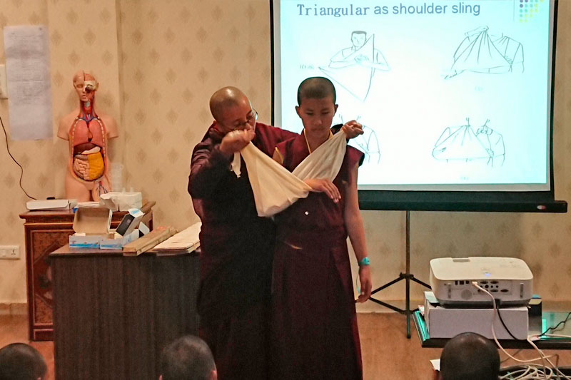 The Healthworker Training Programme, begun during the Second Arya Kshema Winter Gathering, has continued this year. Nuns from six nunneries—Ralang and Tilokpur in India, Karma Leksheyling, Tara Abbey, Osel Karma Thekchöling and Samten Ling in Nepal— have spent eight days studying an advanced course in general healthcare and how to respond to medical emergencies.