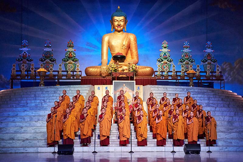 Following both of these invocations of refuge, the umdzes returned to the stage where they intoned The Meditation on the Great Compassionate One: Benefitting Beings Throughout Space, invoking Avalokitesvara, the Noble Chenrezik, who views every sentient being compassionately. Alternating performances, the nuns from the Drupde Palmo Chokyi Dingkhang Nunnery returned, together with the monks of the Vajra Vidya Institute of Thrangu Monastery, for a rendition of A Joyful Aspiration, a poem composed by the His Holiness Gyalwang Karmapa.