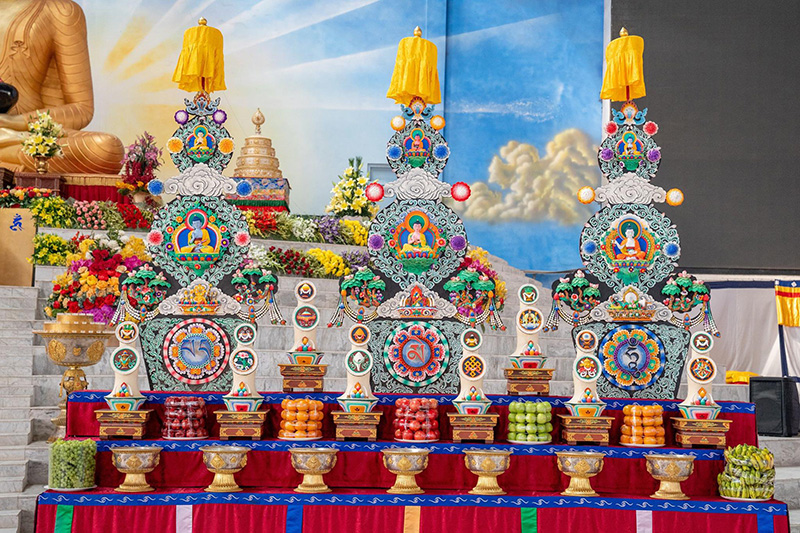 14. The great, seven-foot high tormas used to be on the top tier, but this year, under instructions from the Gyalwang Karmapa, the great tormas were moved down onto the stage itself.