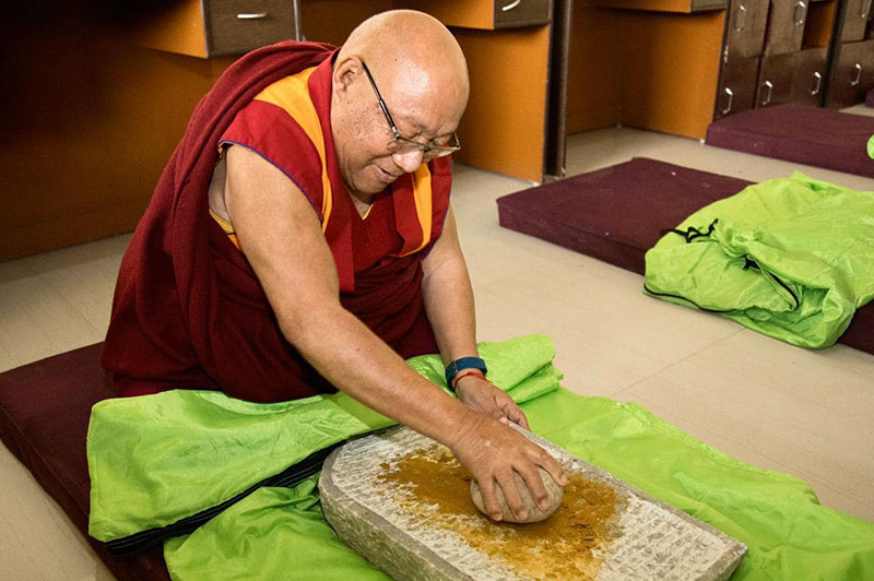 On January 8th, the Ven. Khenchen Lodoe Donyo Rinpoche, who had been presiding over the 22nd Kagyu Gunchoe, visited the project and enthusiastically joined in, using the stone base and round stone to grind the minerals.