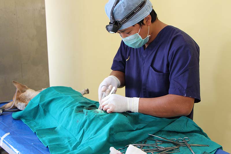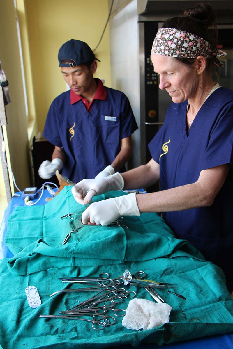 This year the camp operating theatres, storage and administration are being housed in the new kitchen building within the Kagyu Monlam complex, though dogs and other animals receiving on-going treatment are kept outside the building. As previously, there is a walk-in veterinary service provided near the main entrance for local people to bring any ailing domestic animals or pets for advice and treatment free of charge.