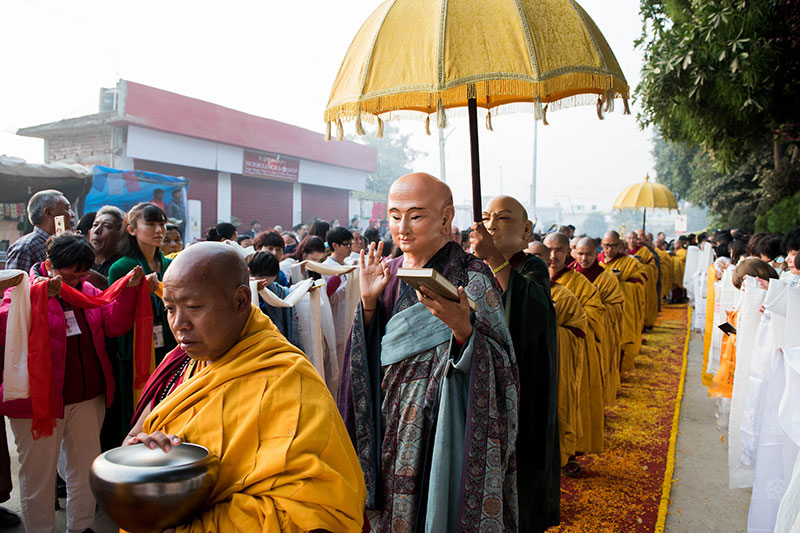With self-possessed precision the Sixteen Arhats, their attendants and the accompanying monks proceeded up onto the stage and fell into position. Closing the procession, a spectacular golden statue of the Buddha was wheeled in and placed inside the pagoda shrine, flanked by two more masked and costumed Elders with ringing staff and bowl, representing the Buddha's main disciples, Shariputra and Maudgalyayana. The final group of monks escorting the statue and taking their places on the tiered seats either side of the stage could well be described as 'innumerable', and must have given Mönlam participants a small taste of what the Buddha's wanderings with his company of bhikshus over these very lands may have been like.