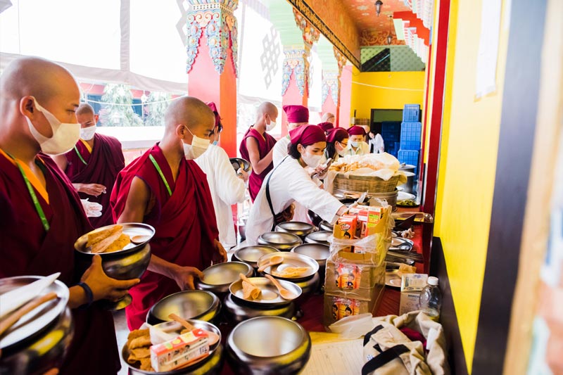 A distinct feature of each Kagyu Monlam is the formal daily lunch in Tergar shrine room specially prepared and offered to fully ordained Sangha, those who hold the vows of gelong [bhikshu] or gelongma [bhikshuni]. All gelong and gelongma are expected to attend.