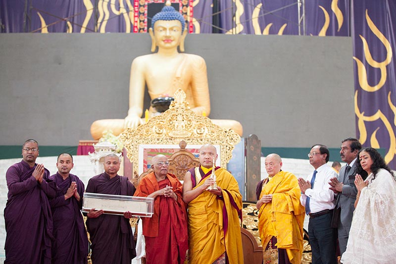 Before coming to the Pavilion stage, the Karmapa met with the Mahathero whose personal warmth broke through the usual formalities as he gave the Karmapa a fatherly hug. Smiling, the two walked onto the stage, and the stupa was placed in a graceful silver pavilion on the Karmapa’s throne. Mahathero was offered a prominent seat while his entourage, all from Chittagong, sat nearby. After the Red Crown ceremony, he opened the stupa to show the Karmapa the cup with the ashes, and with great reverence, the Karmapa placed it on his head, and then on Gyaltsap Rinpoche’s as well. The Karmapa was also offered a thangka of the three deities of long life—Amitayus, White Tara, and Ushnisha Vijaya—and the Karmapa in turn offered the Mahathero a magnificent statue of the Buddha. There was a warm feeling of friendship during this time on stage, and the sense that these precious relics of the great Atisha will have a special place on the Karmapa’s shrine.