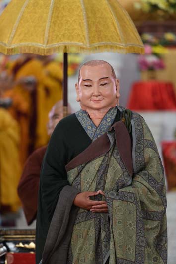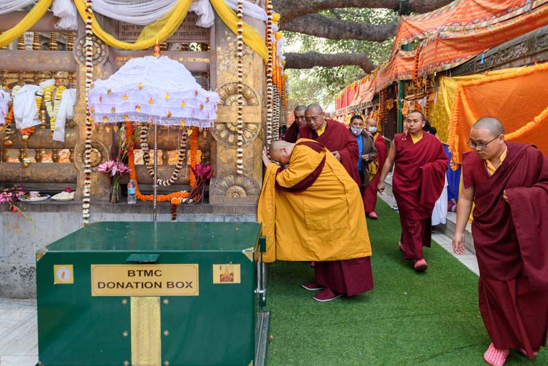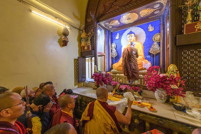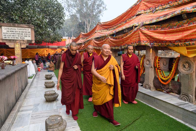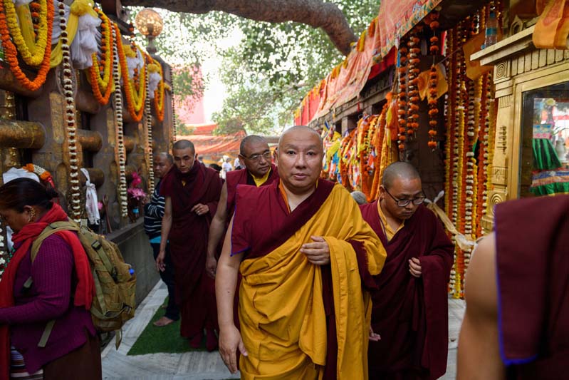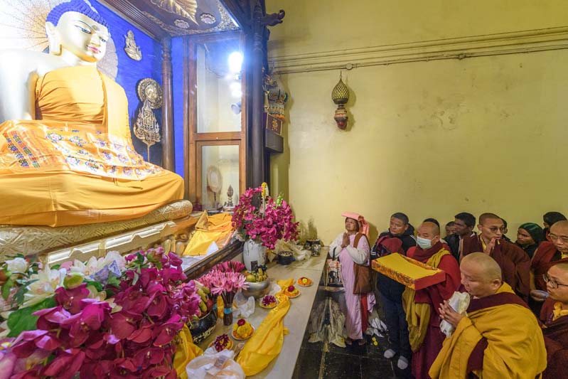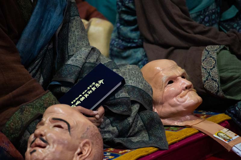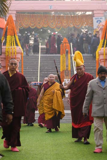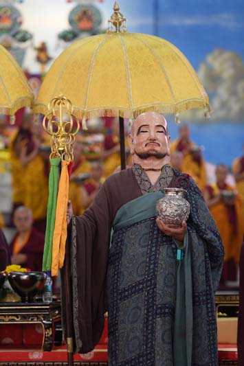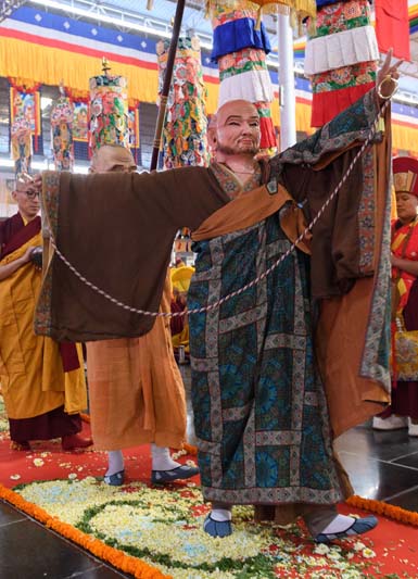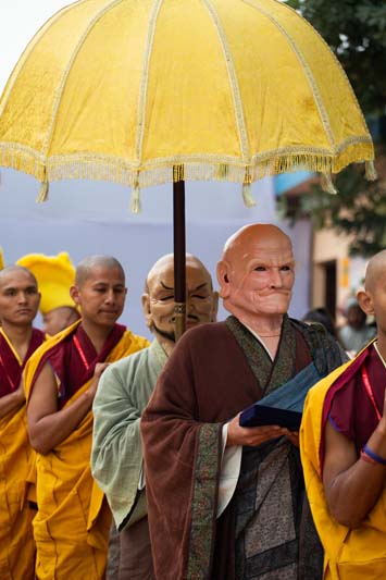 The annual procession of the Cotton-Clad, those who have completed a three year Karma Kagyu retreat, takes place on the final morning of the Monlam. During the Monlam, the retreatants practice in seclusion in the heavily-curtained, Tergar Monastery shrine room each evening, until the culmination is an all-night practice which begins at 8.00pm on the sixth day. On the seventh day, the yogins emerge from the shrine room, dip their thin cotton robes into a tank of cold water in order to demonstrate their proficiency in ‘tummo’, the generation of inner heat, and process to the Monlam Pavilion.