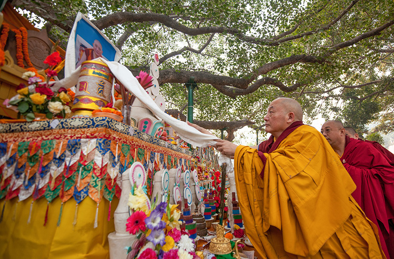 On the first day of the 36th Kagyu Monlam Chenmo, after conferring the Sojong vows, HE Goshir Gyaltsap Rinpoche visited the Mahabodhi Temple. As is the tradition, he made offerings to the golden Buddha before visiting the Great Nyingma Monlam, which is taking place concurrently with Kagyu Monlam.