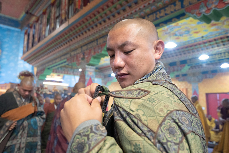 1. The preparations for the procession take place in the shrine room at Tergar. Monks put on their costumes