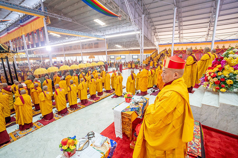 14. On stage, Gyaltsab Rinpoche, the Rinpoches, tulkus, khenpos and gelongs and gelongmas stand respectfully to receive the Arhats.