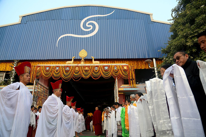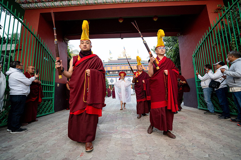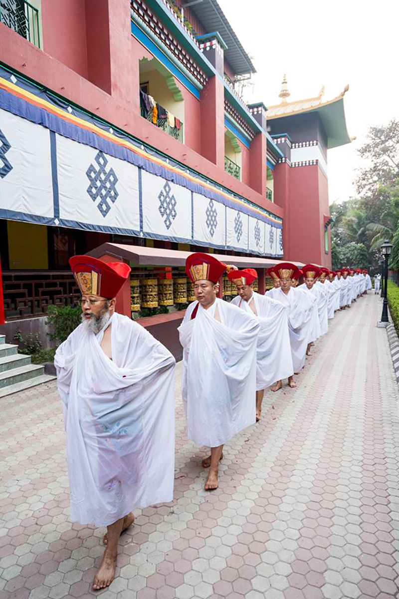 7. The procession begins with a circumambulation of Tergar Temple, led by the Drupon Lama (retreat master) of Rumtek Monastery and the Head Khenpo of Rumtek Shedra.