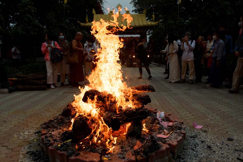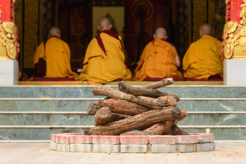 Buddha Akshobhya is the Imperturbable One, who vowed endless patience, and now symbolises overcoming such negative emotions as anger and hatred. Hence, the Akhshobhya Puja is a powerful purification ritual, and the bonfire is built over a pacification mandala. Only those who have received the Akhshobhya empowerment and completed the Akhshobhya retreat may take part, though the public can watch from a distance. During the Monlam, there is the opportunity to submit the names of both the living and the dead, written on paper, for inclusion in this ritual. For many, this puja has become a deeply significant memorial for loved ones and friends who have died, or a chance to help clear obstacles for those who are living.