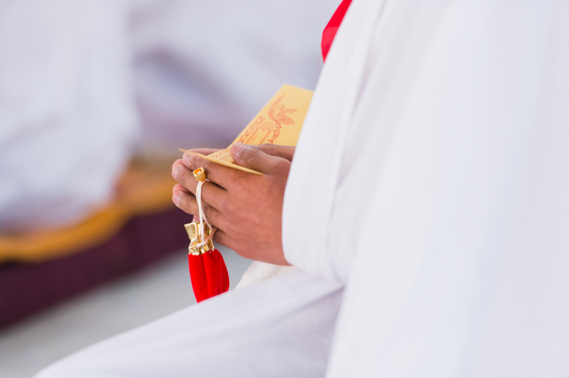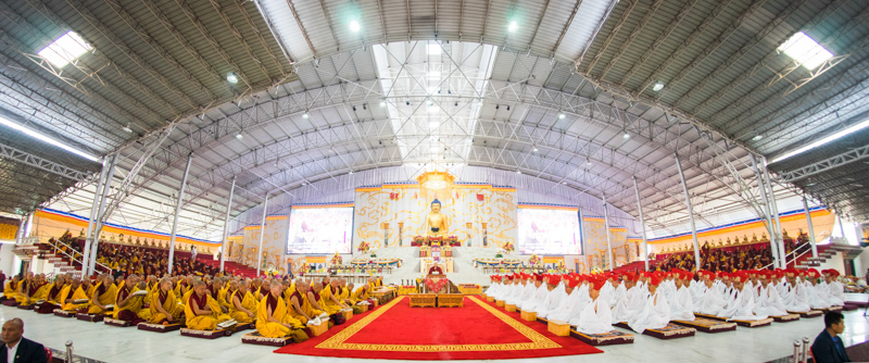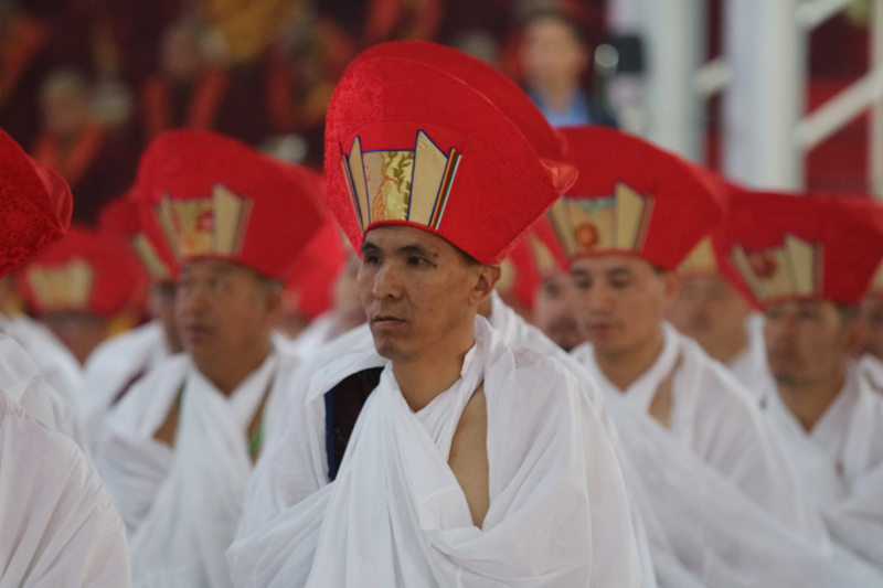 布衣行者坐在法王的左邊,法王的右邊坐著出家僧眾