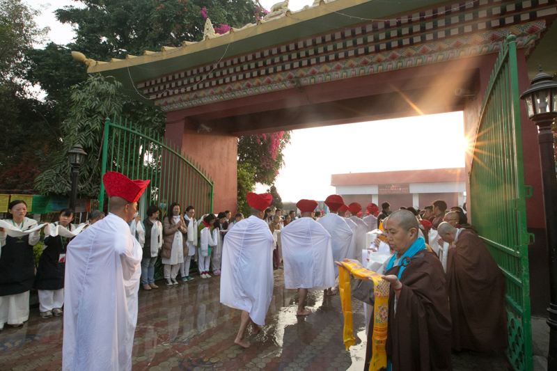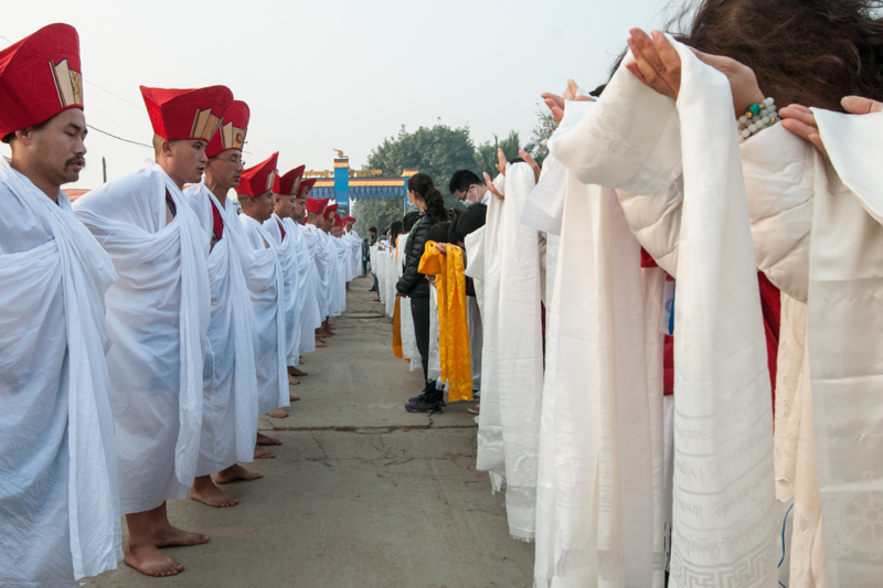 行者走出德噶寺大門,信眾手持哈達或合掌獻祝禱