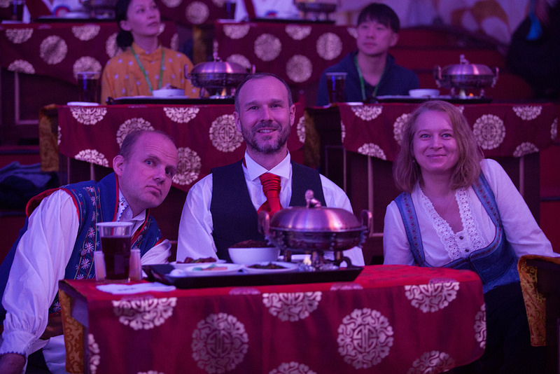 穿著傳統藏服、來自香港噶瑪巴千諾基金會的服務團隊,正要為貴賓上菜。